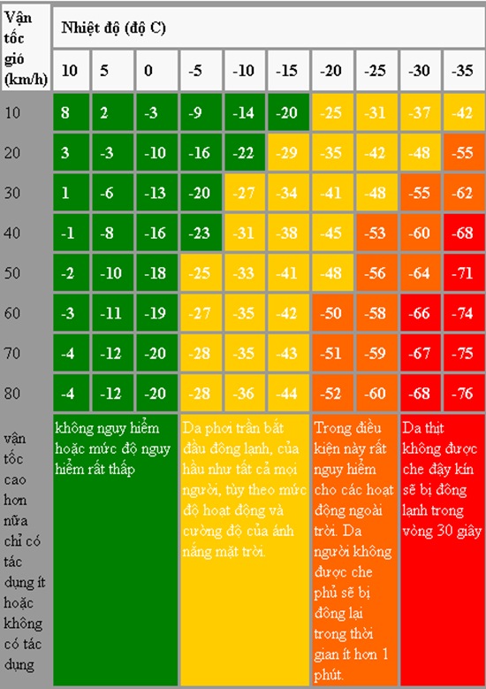 Twc là nhiệt độ Windchill bằng °C, T là nhiệt độ thực tế bằng °C, vw là vận tốc gió bằng km/h và SQRT là căn số ( square root)